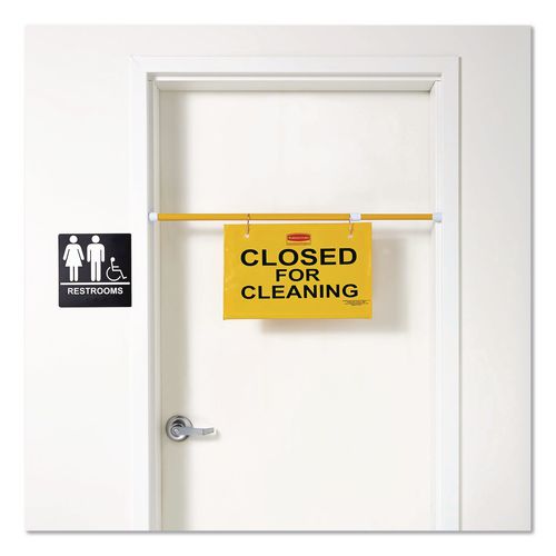 Safety sign imprinted with "Closed for Cleaning" is mounted on a twist-action pole that extends up to 50" wide to prevent entry through even wide hospital doors.
