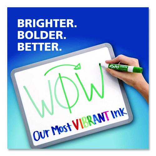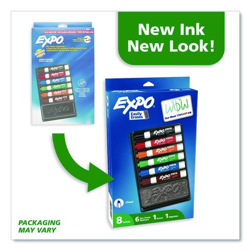 - Seven-piece kit contains one EXPO® eraser and six low-odor chisel tip markers in black, blue, green, orange, red and brown.