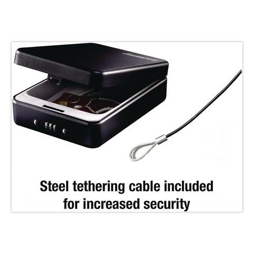 Portable lock box offers versatile and reliable, on-the-go security. Featuring a solid steel body, tethering cable and programmable three-digit, roller-style combination lock, it's ideal for protecting your most valuable compact items: jewelry, storage devices, smartphones, wallets, keys and more.