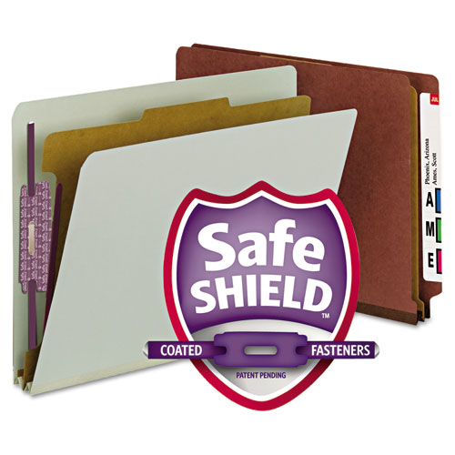 The ultimate classification folder when safety and security are most important. SafeSHIELD® bonded fasteners add protection for papers and fingers, while also reducing fastener crinkling. Dividers with tabs and fasteners on both sides let you store information under several subdivisions, and fasteners on the front and back panels add two more filing surfaces. Made of heavyweight pressboard material for extra durability. Use different colors for different types of projects. Labels sold separately.