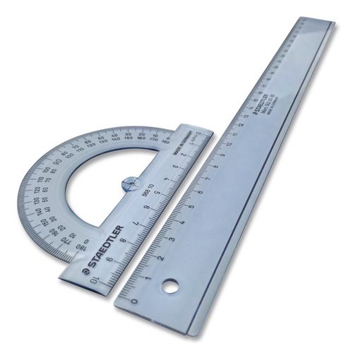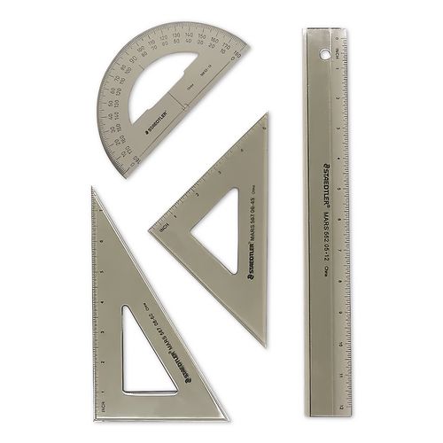 - Includes a 12" ruler, a 180° protractor, a 60° set square and a 45° set square.
