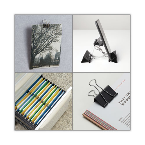 Ultra-efficient binder clips feature handles that can be hung, folded flat against clipped material, or removed for permanent binding. Efficient triangular design provides optimum strength and compression.