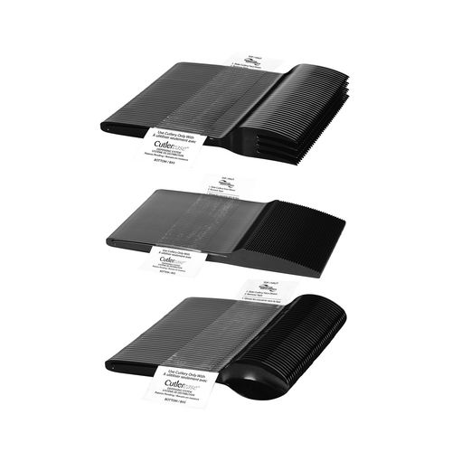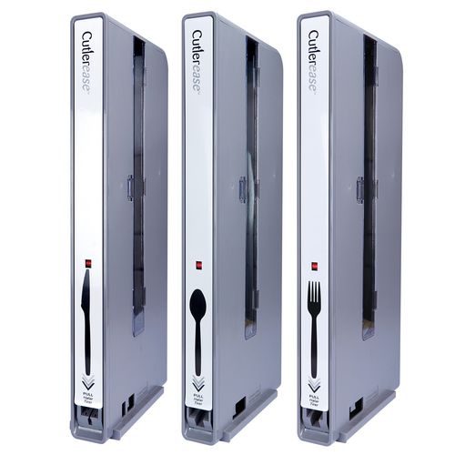 Delivers on hygiene, no cross contamination due to a catch tray to drop into. Easy loading with tape tabs to hold onto and avoid the need to hold onto the cutlery itself. 3:1 space savings over competition. Convenient, no power required. Stand alone cartridges slide in and out for easy handling. Waste reduction, take only one piece at a time. Kit includes a triple Dispenser Base, a fork tower dispenser, a spoon tower dispenser and a knife tower dispenser. Each dispenser holds 120 utensils (sold separately).