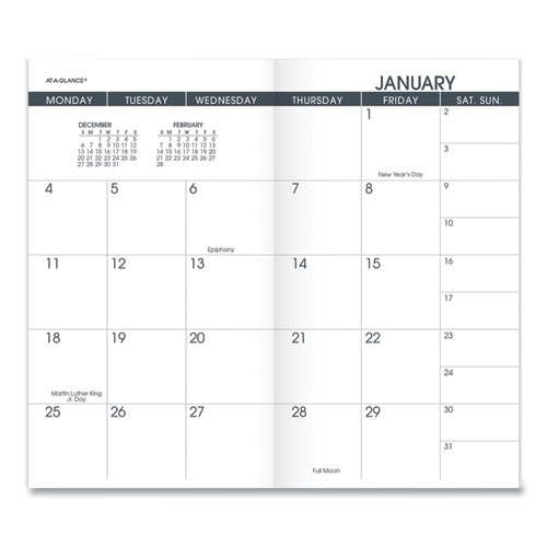 - One month per two-page spread with unruled blocks; Monday start; past and future months reference.
