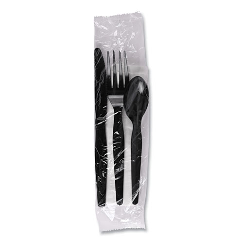 Four-Piece Cutlery Kit, Mediumweight, Fork/Knife/Napkin/Spoon, Plastic, Black, 250/Carton