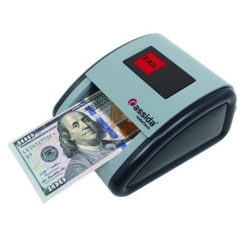 Instantly check a bill's authenticity with this automatic counterfeit detector. It uses advanced infrared sensors and a comprehensive database of mapped infrared, magnetic and ultraviolet bill markings to verify if cash is legitimate or counterfeit. Verifying the infrared security markings on a bill is a highly reliable anti-counterfeit protection available in paper currency, far more reliable than trying to check for watermarks with a pen or UV light. This compact counterfeit detector has a simple Pass/Fail interface that provides clear, quick feedback on a bill's authenticity. Simply insert the currency in question in the direction illustrated on the machine (face up, facing outward). Cassida's U.S.-based support team is ready to help. If you count on cash for your business, count on one of America's trusted brands in business-grade currency counterfeit detector handling solutions.