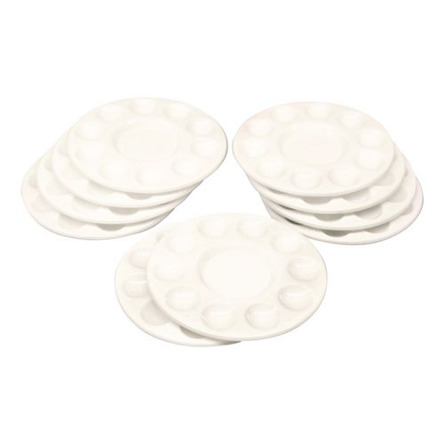 Durable white plastic round trays with ten paint wells.