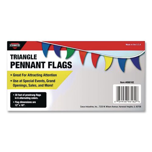 Attention grabbing string of pennant flags. Includes five bright colors.