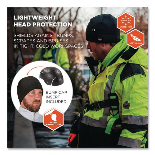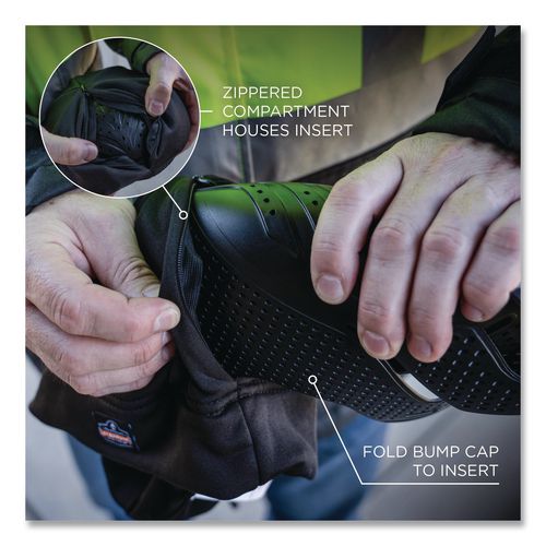 Beanie hat provides warmth for mild to cold, as well as lightweight protection from bumps, scrapes, bruises and other minor head injuries. Wear alone as a skull cap hat or open the top zippered compartment to add the Bump Cap (included) for work in cramped spaces. This winter hat is made of stretchable polyester fleece for a comfortable snug fit that traps heat. When worn without the bump cap insert, it makes for a great thermal layer under hard hats or helmets.