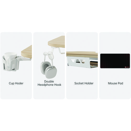 - Includes cup holder, headphone hook, cable management tray, and cloth mouse pad.