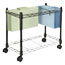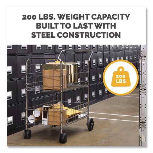 Top basket with adjustable guides holds up to 150 letter or legal files. Bottom shelf for bulk mail or packages. Twin-wheel front casters and large rear wheels. Chrome-plated steel wire construction. 200 lb capacity.