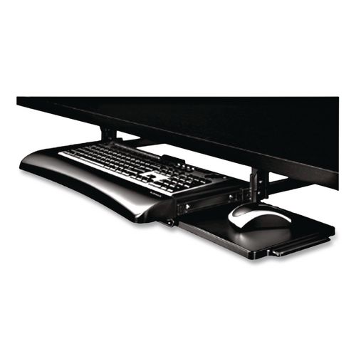 Features three height adjustments to suit preferred work position. Sturdy impact-resistant tray fits standard keyboards. 23.5" wide space required for installation. Mouse tray mounts to right or left side of keyboard tray or stows underneath.
