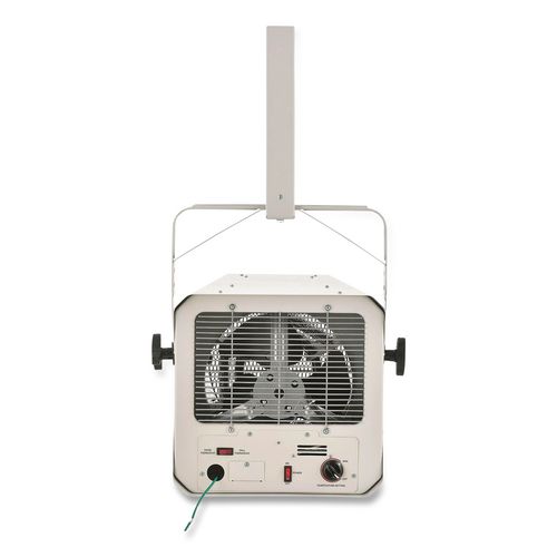 Great addition as a supplementary or primary heat source, this heater can be mounted on a wall or ceiling using the mounting bracket provided to quickly heat enclosed spaces without taking up any floor space. Unit heater can be tilted vertically. The list of ideal spaces includes garages, stores, maintenance rooms, basements, public buildings, factories, service stations, stairwells, power stations, mechanical rooms, stock rooms and workshops. This forced air unit heater uses a fan to push air over heating elements to quickly create hot air that is evenly distributed into a room to reach desired temperature levels. In addition, louvers adjust up and down for even greater control of throw direction. The unit is easily turned on with a push of a button. Easy to use built-in turn dial thermostat goes from Off position all the way up to Max and can be set at desired comfort level. It is constructed from cold rolled steel for extra toughness and durability. The unit comes equipped with thermal cut-off protection, a safety feature that will automatically turn the heater off if overheating occurs. This heater is a dual-phase unit shipped from the factory wired for single-phase and can be converted easily into three-phase operation. Easy to install and quick access to control box and wiring makes it easy to service.