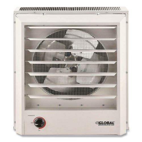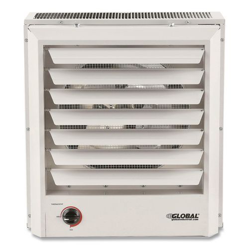 This is a great addition as a supplementary or primary heat source to quickly heat enclosed spaces without taking up any floor space. The list of ideal spaces includes garages, stores, maintenance rooms, basements, public buildings, factories, service stations, stairwells, power stations, mechanical rooms, stock rooms and workshops. This heater can be mounted vertically or horizontally on to a ceiling using threaded mounting rods and requires four 5/16"-18 thread size rods (sold separately) to fit into the threaded holes on the heater with at least 7.5" length and secured in place using lock nuts. This forced air unit heater with advanced pull-through air flow design draws air across heating element to quickly create hot air that is evenly distributed into a room to reach desired temperature levels. In addition, louvers adjust up and down for even greater control of throw direction. Easy to use built-in turn dial thermostat goes from Min position all the way up to Max and can be set at desired comfort level to cycle on and off automatically. It is constructed from cold rolled steel for extra toughness and durability. The unit comes equipped with thermal cut-off protection, a safety feature that will automatically turn the heater off if overheating occurs. Easy to install and quick access to control box and wiring makes it easy to service.