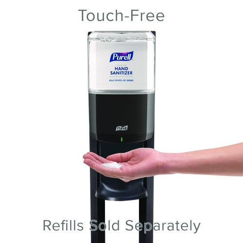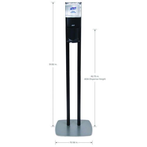 Touch-free dispenser stand for PURELL® Hand Sanitizer. Freestanding design, ideal for high-traffic areas. Low profile baseplate designed to maximize stability. Lightweight and easily moved when cleaning the facility. Silver baseplate hides dirt and always looks good. Includes PURELL® ES6 Hand Sanitizer Dispenser.