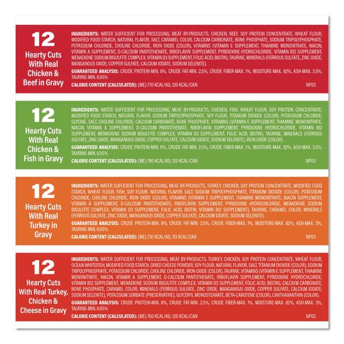 You can indulge your cat with all the delicious flavors and textures found in this wet food variety pack. Satisfy your cat with big meaty chunks, cuts and shreds in a thick, rich gravy.