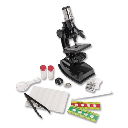 - Magnifies up to 600x and includes vials, tweezers, hand magnifier, two prepared slides and cover slips.