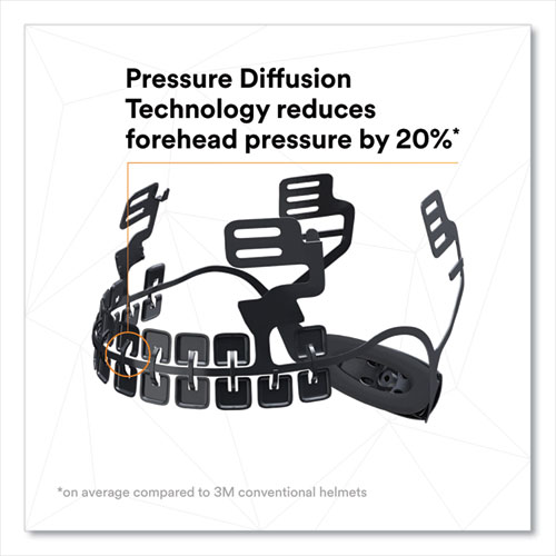 Climbing helmet-inspired, brimless design meets occupational safety requirements while helping the wearer maintain greater situational awareness by delivering an obstruction-free field of vision. Low-sitting suspension system features exclusive, patented Pressure Diffusion Technology, enabling the system to self-adjust to the wearer as the smooth, easy-turning ratchet is tightened.