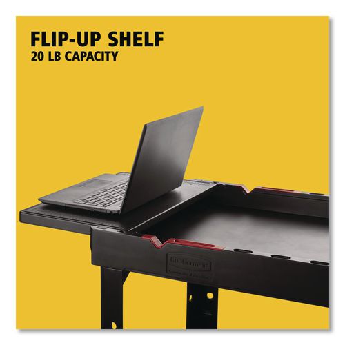 - Flip-up shelf eliminates the need to clear top shelf contents for workspace.
