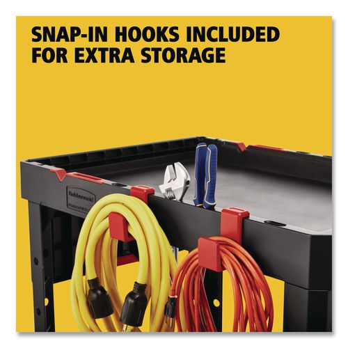 Provides superior versatility for tackling whatever task is at hand. Crafted of structural foam, this rolling service and utility cart can support up to 250 lb per shelf while reducing the need for time-consuming user modifications Features a variety of integrated features including an ergonomic adjustable handle with four positions for maximum comfort, a flip-up shelf, a slotted rim for small tool storage, two snap-in hooks for wrapping extension cords and locking casters to keep the cart stable during use.