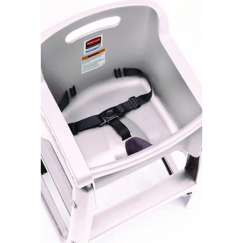 Attractive contemporary styling complements most dining room and activity room decor schemes. Microban antimicrobial product protection helps prevent the growth of stain- and odor-causing bacteria, keeping chairs looking new. No-tilt/no-pinch design provides peace of mind. Rust-, chip- and dent-proof heavy-duty molded plastic cleans up easily with soap and water. Adjustable, one-piece T-bar and safety harness comfortably secures older infants and toddlers. Convenient backrest handle enables easy, one-handed maneuvering.