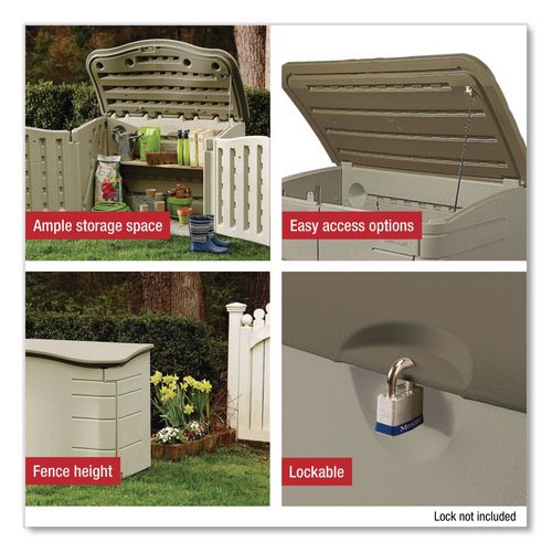 Freestanding, weather-resistant and stay-dry resin horizontal design outdoor shed. With a large 20 cu. ft. storage capacity, this horizontal garden shed offers the ideal storage for garden tools, cushions, garden accessories and bins. With a padlock clasp (padlock not included), you can be sure that your tools are safely stored and secure. Lift up lid with prop rod and tough, durable floor included. Accommodates wood shelf (not included), lockable doors and lid. Easily assembles in less than 30 minutes.