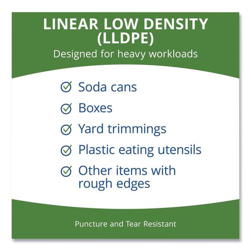 - Multiuse, strong, low-density recycled plastic bags provide maximum puncture and tear resistance.