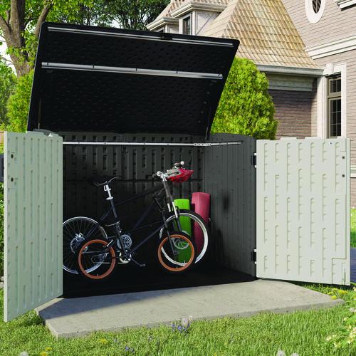 At 70 cu ft, this horizontal shed by Suncast is the perfect solution for hiding your unsightly garbage cans and organizing your lawn and garden equipment. The storage space is sufficient for holding up to two 96-gallon waste containers or it can house other items such as furniture cushions, bicycles, firewood and gardening supplies. Two front-opening doors along with the top-loading lid allow easy access to your items. Gas shocks assist for a one-handed lift operation and ensures that the lid will stay open while in use. Additionally, this horizontal shed has a soft-close hinge that is designed to prevent the lid from closing too quickly or slamming shut. Constructed of steel-reinforced, multi-wall resin, this durable shed is built to withstand the elements throughout any season.