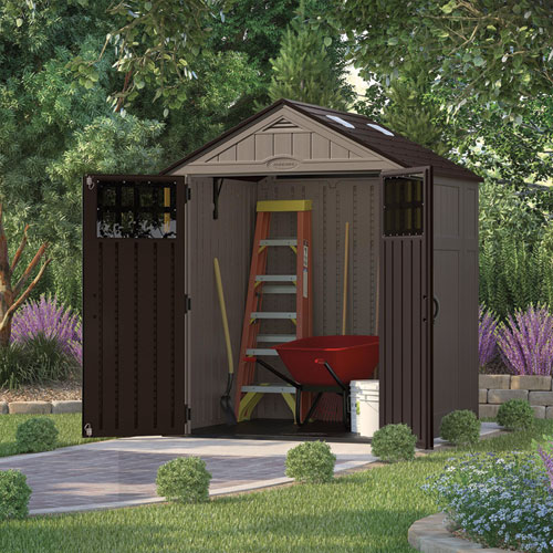 From yard tools to lawn mowers, this 201 cu ft Everett storage shed by Suncast is perfect for storing away all of your outdoor equipment. Large double-door entryway provides easy access to your belongings and is equipped with pad-lockable resin handles for security (lock not included). The reinforced resin floor is built to withstand heavy loads and can handle a wide range of items. Built-in skylights and large door windows light up the space on a sunny day. Constructed of metal-reinforced, multi-wall resin panels, this attractive shed can withstand the elements while looking great in your yard all year long.