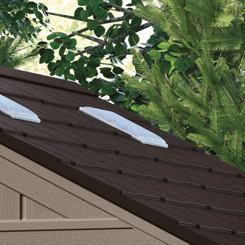 - Classic shed design with architectural details and metal reinforced shingle-style roof panels.